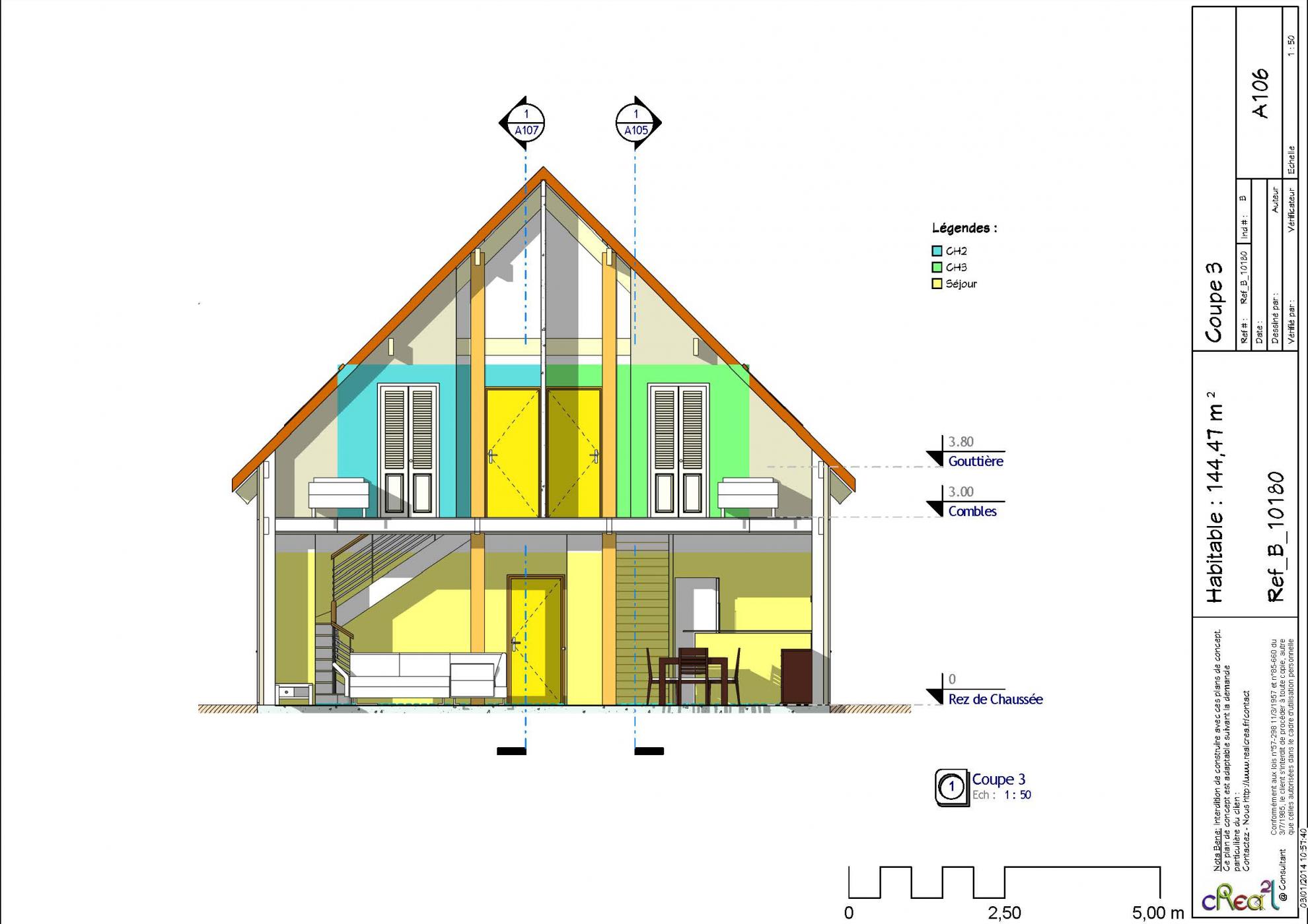 Plan B_10180 : Maison à ossature bois, R + Combles, 4 chambres ayant 154 m² habitables.