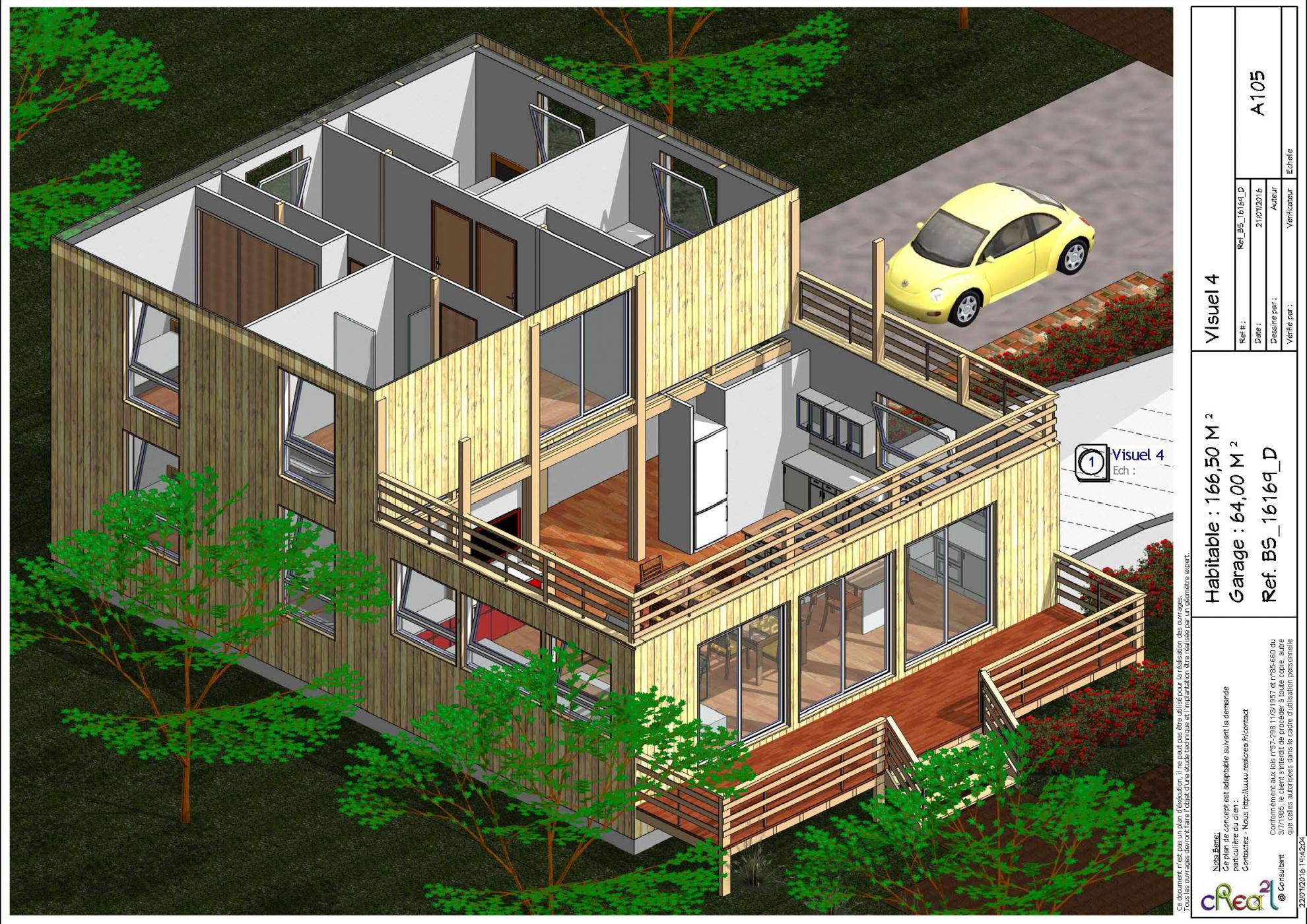 Plan BS_16169_D : Maison Bois contemporaine, T5, 166 m², 5 Chambres, Grand séjour, Cuisine ilot central, sous sol complet, grand Garage.