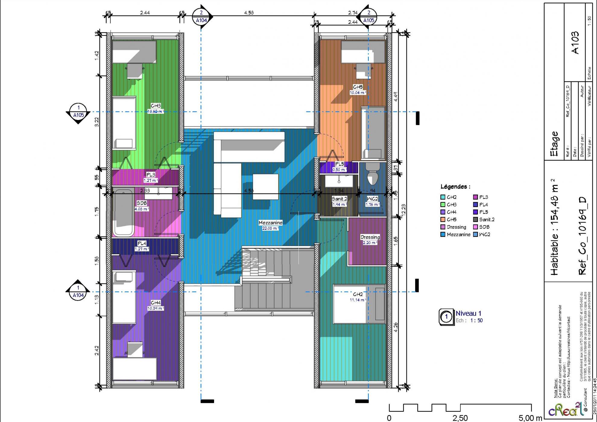 Plan Co_10169_D : Maison container R+1 ayant 154 m² habitable, 5 chambres et l'abri automobile intégré.